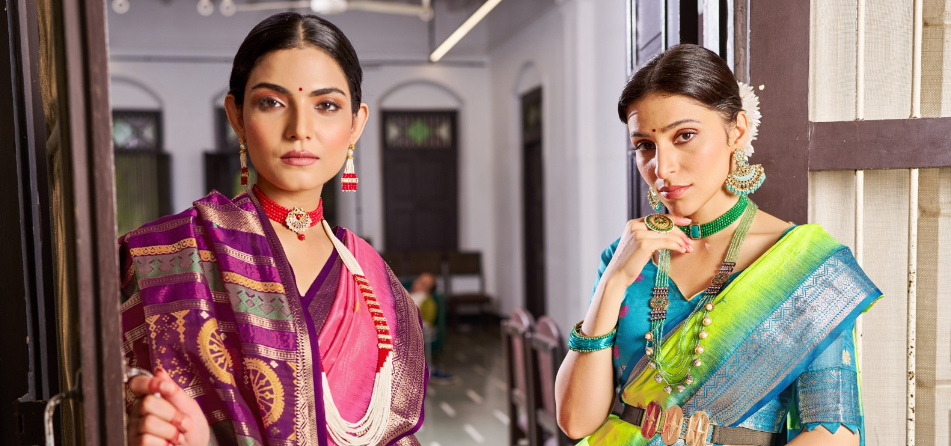 Our master weavers design unique sarees in-house, combining the best of both worlds – traditional and modern.