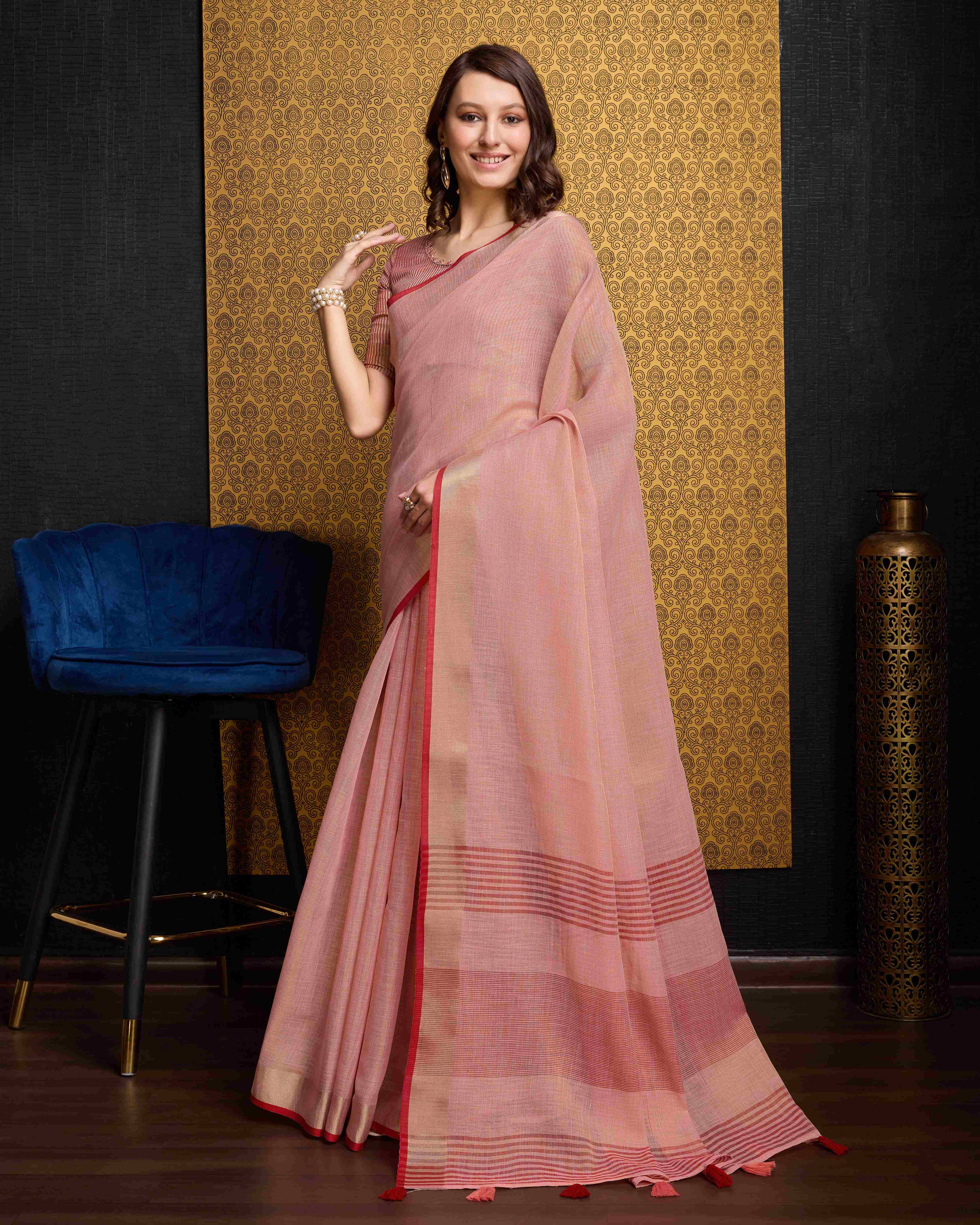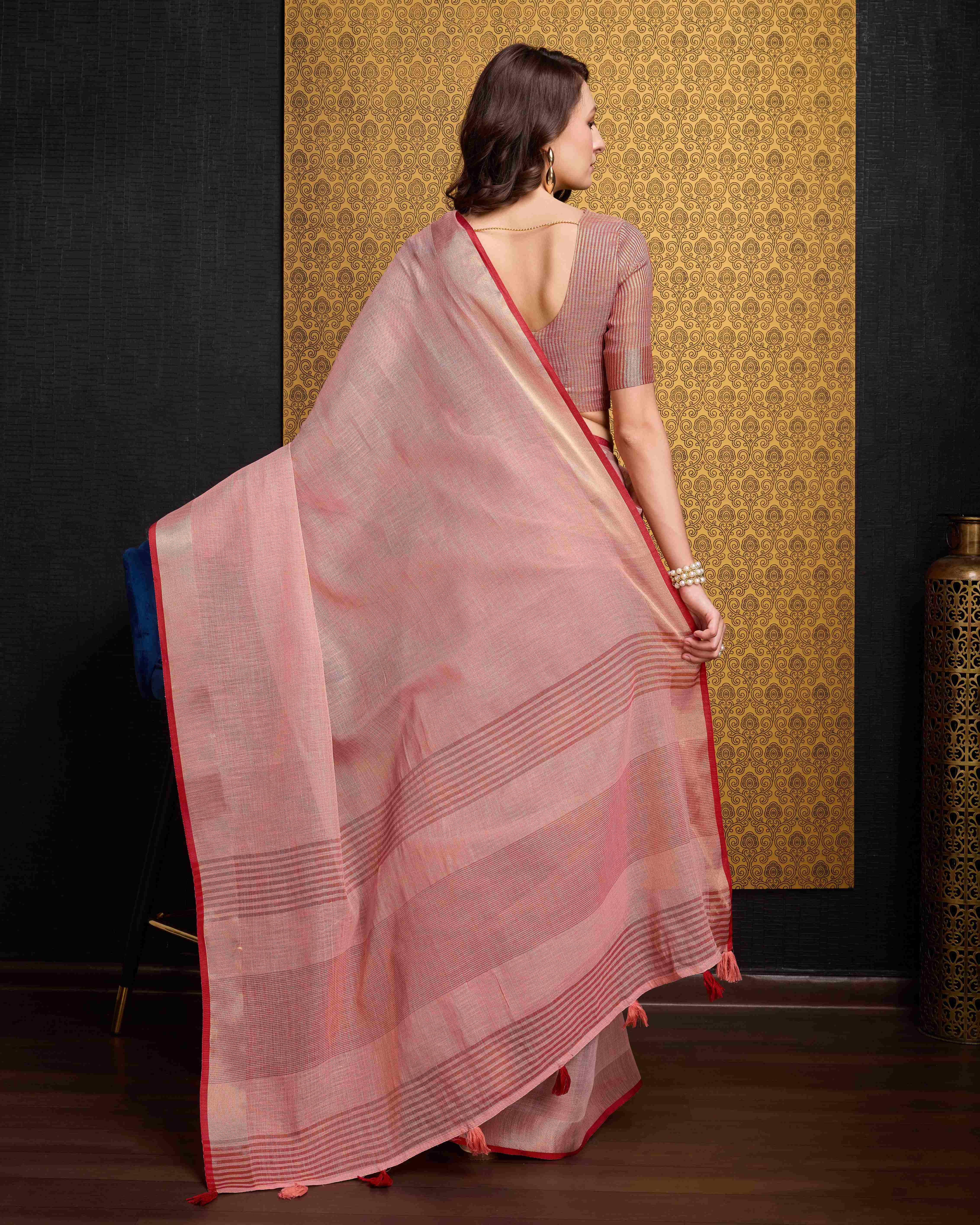 Peach Cotton Linen Saree With Pure Cotton Unstitched Blouse Piece