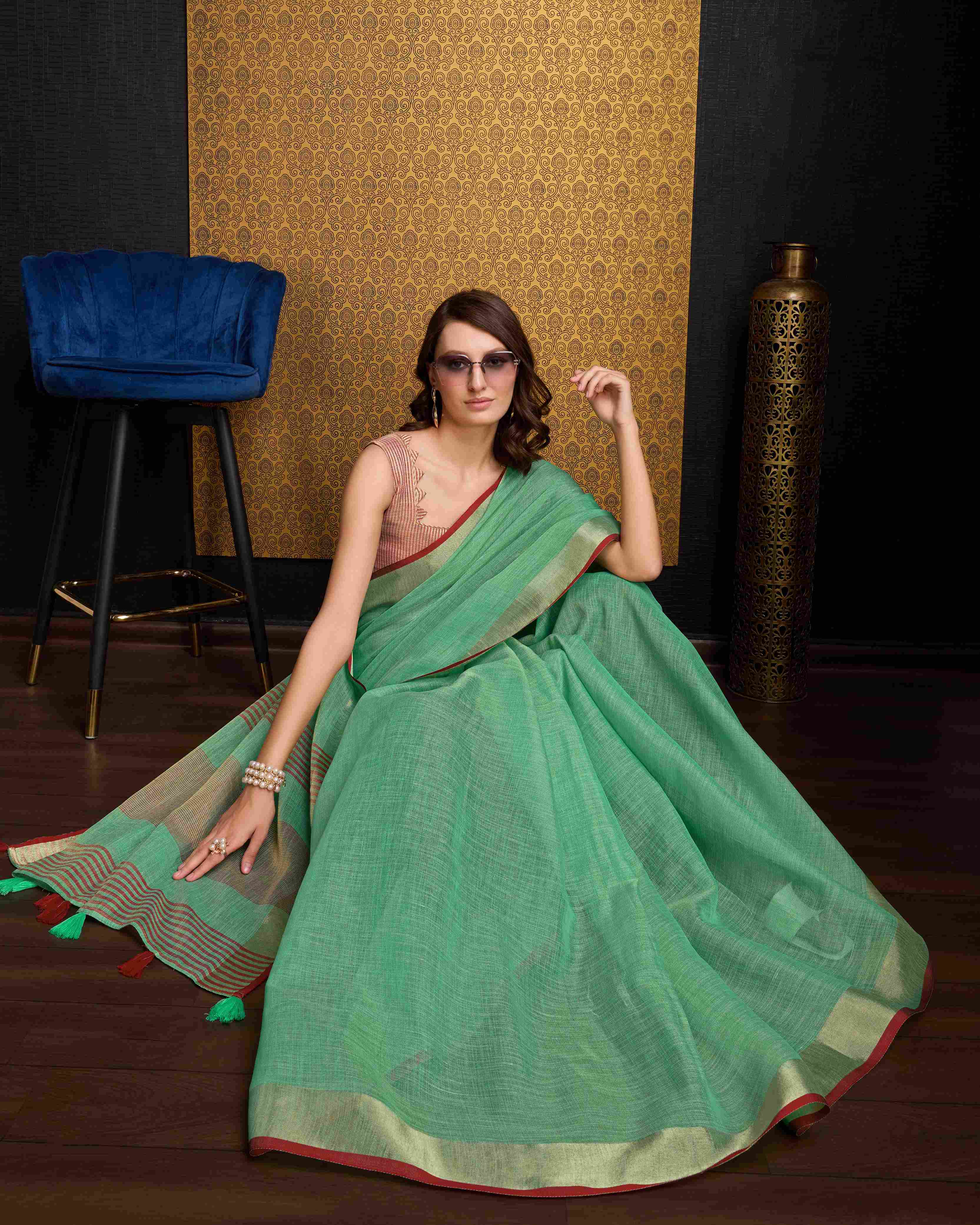 Sea Green Cotton Linen Saree With Pure Cotton Unstitched Blouse Piece